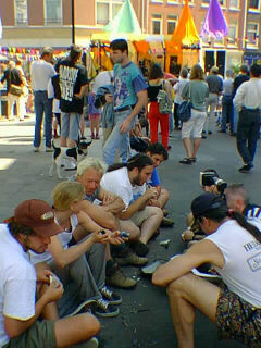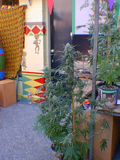 Some interesting booths were there including two specializing in marijuana production. The Sensi and Positronics booths displayed live marijuana plants (it's legal to grow up to 5 plants per person in Holland). Both companies sell equipment and supplies for indoor greenhouses. The Sensi Seed Bank is famous for it's award winning bio-engineered strains of cannabis. Their talent was evident by the plants on display with huge skunk buds (see photo below). The Positronics Sinsemilla Fan Club had starter plants for sale. Other booths included a hemp clothing store, hemp food products, and general information about hemp.