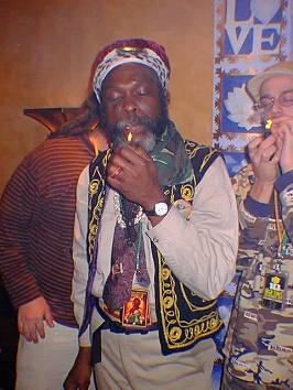 Menilik, an elder of the Rastafarian faith, originally from Kingston, Jamaica added a spiritual depth to the events at the Cannabis Cup. A singer and percussionist, he has performed with such reggae stars as Bob Marley and the Wailers, Sugar Minott and Jah Levi. Dressed in a beautiful white robe he performed the induction of Bob Marley into the Cannabis Hall of fame. |